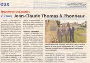 Le « Prix Hervé Le Menn », décerné chaque année par le jury de l’Entente Culturelle Bretonne a été attribué pour cette année 2014 à Jean Claude THOMAS président de l’association « Racines et Patrimoine » pendant douze années, de 2002 à 2014, afin d’honorer ses activités en faveur du patrimoine local et afin de mettre en lumière ses travaux d’études et de recherches liés à Paul Antoine Fleuriot de Langle, né au Manoir de Kerlouet en Quemper-Guezennec, commandant de l’Astrolabe dans l’Expédition autour de monde dirigée par Jean-François Galaup de Lapérouse au XVIIIème siècle.