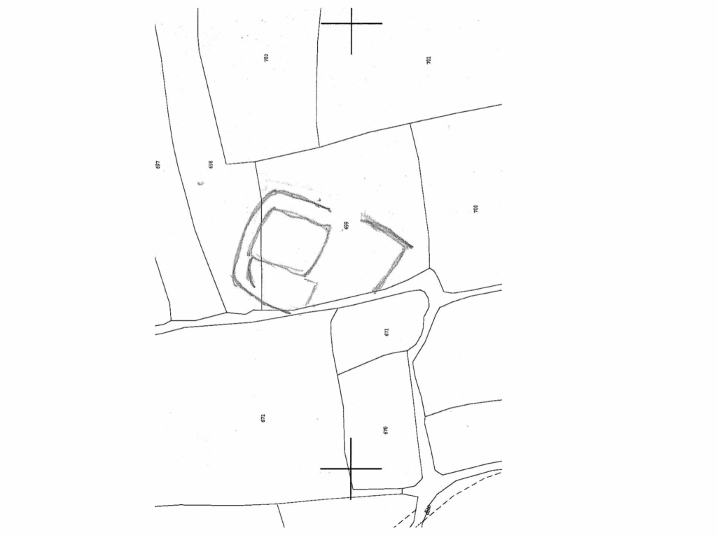 Enclos en foncé sur l’image aérienne, dessiné sur le cadastre, et objet d’une prospection
