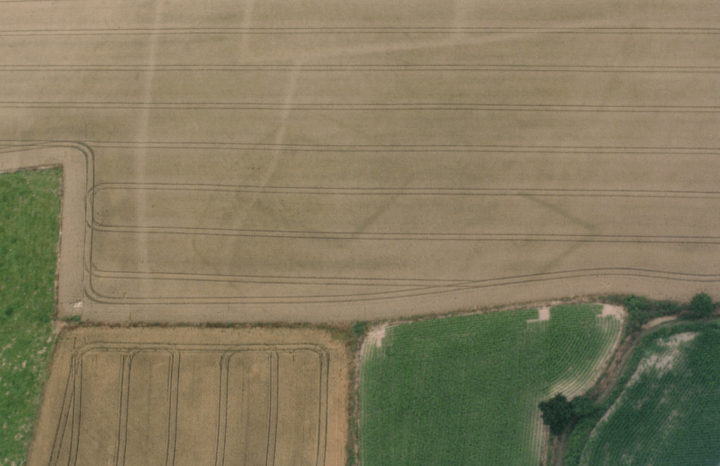 Juxtaposition du parcellaire actuel et du parcellaire ancien (tracé clair), Prospection aérienne du 13/07/2006 – C. Bizien-Jaglin