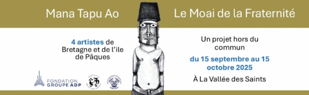 Le grand projet qui liera l’Ile de Pâques (ou Rapa Nui en langue locale) et la vallée des Saints est entré dans le plus concret le 15 septembre 2025. Quatre sculpteurs chiliens et bretons ont commencé la sculpture du Moaï gigantesque en granit destiné à être placé sur le site de la Vallée des Saints (lien vers « L’Ile de Pâques bretonne »). Deux sculpteurs bretons, Kito et Vincent Le Masson s’associent à deux sculpteurs chiliens, Alberto Ika Araki et Ignacio Ika Sanchez, pour réaliser cette œuvre monumentale de 5 mètres 40 appelé « Moaï de la Fraternité ». Après avoir voyagé par Lorient, Quemper-Guézennec et Brest, elle sera installée à Carnoët en avril 2026.