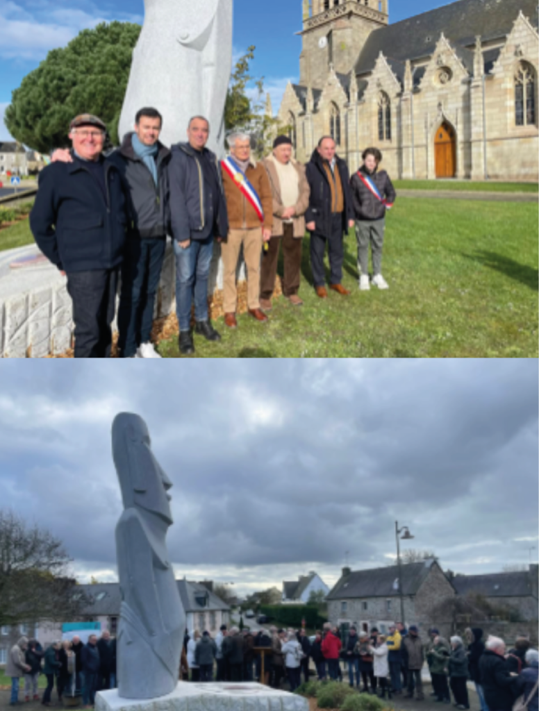 «En ce 14 février 2026, jour d’amour et de retrouvailles, un frère est enfin rentré chez lui. À Quemper-Guézennec, berceau de Paul Antoine Fleuriot de Langle, le Moaï de la Fraternité-Mana Rapu Ao- veille désormais de ses 6 mètres de granit breton près de l’église St Pierre. Un géant de 20 tonnes, sculpté à Carnoët par quatre mains unies : Alberto Ika Araki et Ignatio Ika Sanchez (gardiens du mana Rapa Nui) et Kito Antoine er Vincent Lemaçon (porteurs de l’âme bretonne). Un merci vibrant de L’Île de Pâques à notre explorateur breton, premier à en dresser la carte en 1786 avec Lapérouse. Ce Moaï accomplit son Tro Breizh : après Brest, ici aujourd’hui, bientôt Lorient… puis pour l’éternité à la Vallée des Saints, face à la carte de 1786.